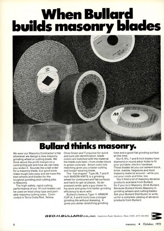 You'll find a lot of masonry abrasive products available from Bullard. So if you're in Masonry, think Bullard. Because Bullard thinks Masonry in grinding wheels and cutting blades. Ask your Bullard Distributor or write us for a complete catalog of abrasive products from Bullard.