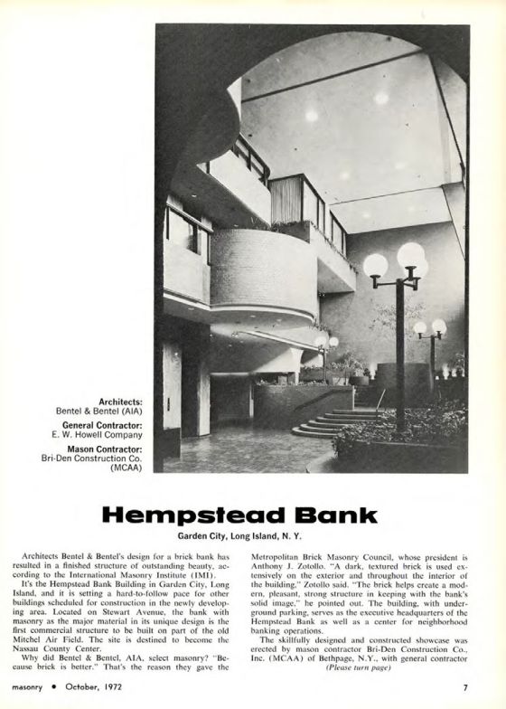 Why did Bentel & Bentel, AIA, select masonry? "Because brick is better." That's the reason they gave the Metropolitan Brick Masonry Council, whose president is Anthony J. Zotollo. "A dark, textured brick is used extensively on the exterior and throughout the interior of the building," Zotollo said. "The brick helps create a modern, pleasant, strong structure in keeping with the bank's solid image," he pointed out. The building, with underground parking, serves as the executive headquarters of the Hempstead Bank as well as a center for neighborhood banking operations.