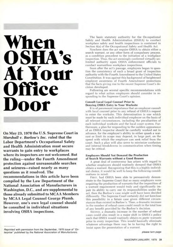 On May 23, 1978 the U.S. Supreme Court in Marshall v. Barlow's Inc. ruled that the Labor Department's Occupational Safety and Health Administration must secure warrants to gain entry to workplaces where its inspectors are not welcomed. But the ruling-under the Fourth Amendment protection against unreasonable searches and seizures-raised nearly as many questions as it resolved. The recommendations in this article have been compiled by the Law Department of the National Association of Manufacturers in Washington, D.C., and are supplemental to those already submitted to MCAA Members by MCAA Legal Counsel George Plumb. However, one's own legal counsel should be consulted in individual situations involving OSHA inspections.