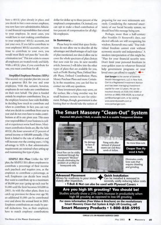 Please keep in mind that space limitations do not allow me to describe all the advantages and disadvantages of each type of plan mentioned, nor does it allow me to cover the whole spectrum of plan choices that now exist for you. In next month's article, however, I will delve into the other types of plans that are available for you, such as Profit-Sharing Plans, Defined Benefit Plans, Defined Contribution Plans, Money Purchase Plans and more. Certainly, in the meantime, you can feel free to contact me with any questions.