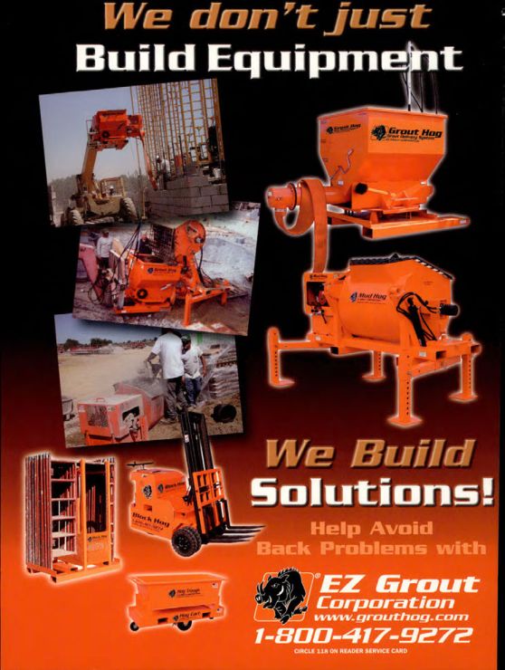 Masonry Magazine May 2003 Page. 68 Masonry Magazine May 2003 Page. 68 We don't justBuild Equipment`Mad Hog`Grout Hag`Block Hog` We BuildSolutions!Help AvoidBack Problems withEZ GroutCorporationwww.grouthog.com1-800-417-9272CIRCLE 118 ON READER SERVICE CARD