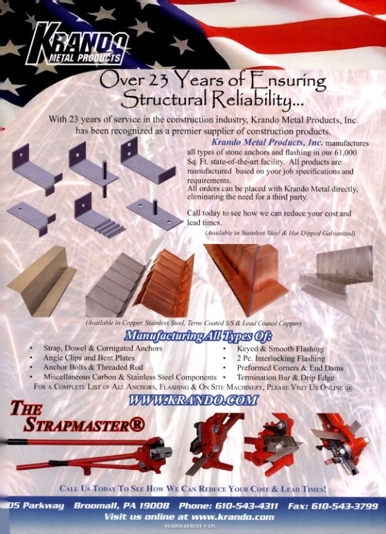 Krando Metal Products, Inc. manufactures all types of stone anchors and flashing in our 61,000 Sq. Ft. state-of-the-art facility. All products are manufactured based on your job specifications and requirements. All orders can be placed with Krando Metal directly, eliminating the need for a third party.