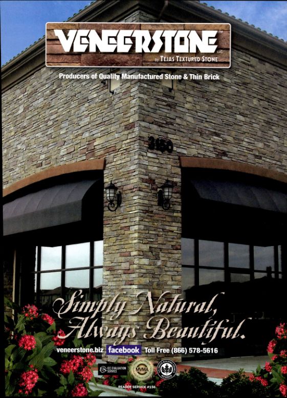 Masonry Magazine July 2011 Page. 7 Masonry Magazine July 2011 Page. 7 VENEERSTONEby TEJAS TEXTURED STONEProducers of Quality Manufactured Stone & Thin BrickLIC Simply Natural, Always Beautiful. veneerstone.biz facebook Toll Free (866) 578-5616SERVICEMVMAREADER SERVICE #156
