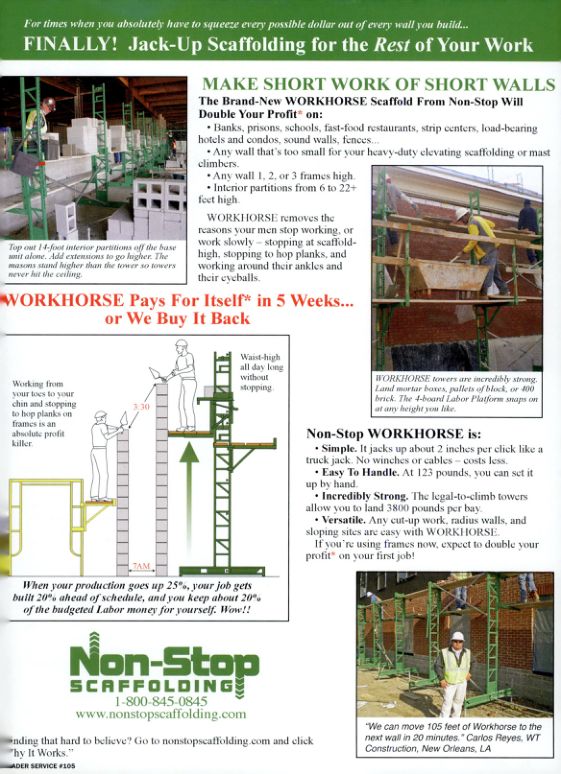 The Brand-New WORKHORSE Scaffold From Non-Stop Will Double Your Profit* on: Banks, prisons, schools, fast-food restaurants, strip centers, load-bearing hotels and condos, sound walls, fences...