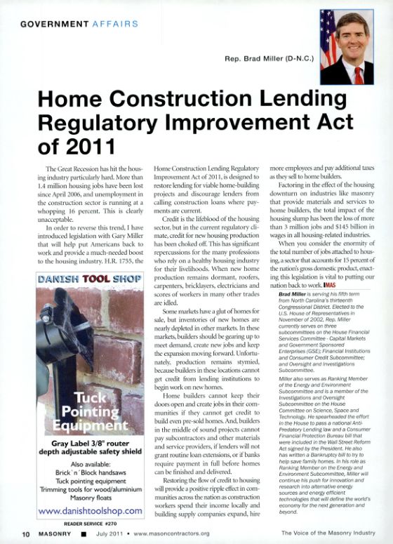 In order to reverse this trend, I have introduced legislation with Gary Miller that will help put Americans back to work and provide a much-needed boost to the housing industry. H.R. 1755, the Home Construction Lending Regulatory Improvement Act of 2011, is designed to restore lending for viable home-building projects and discourage lenders from calling construction loans where payments are current.
