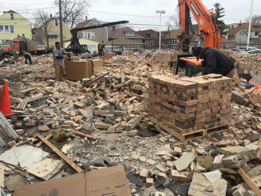 Extracting and preserving brick intended for recycling is part of a detailed process. When a building is scheduled for demolition, the contractors obtain all proper permits. Demolition follows. The contractors then separate materials that still hold value, like brick and steel. A stacking crew then sorts each material by color, removes debris, and stacks atop wooden pallets. The pallets are wrapped in cardboard and metal bands. Bricks Inc. boom trucks visit the site and pick up the pallets. Bricks Inc. staff then loads materials and other vehicles bound for their new home.