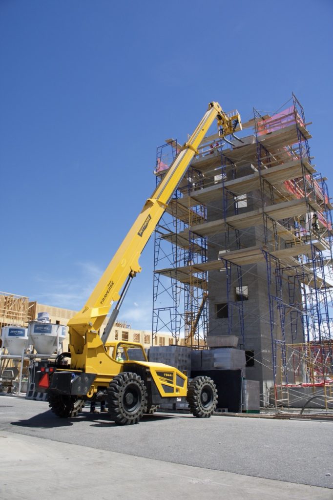 For example, a 9,000-pound-capacity telehandler with 44-foot lift height may be capable of tackling most of a contractor’s jobs; however, when working at increased heights or when needing extra reach to operate from a street-side position, a 10,000- or 12,000-pound machine and/or a higher-reaching 56-foot unit may be necessary to accommodate the de-rating of the boom as it extends out fully with a load.