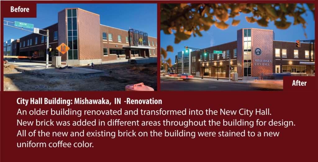 Here are two beautiful projects completed within the last two years. The first one, pictured below, is of Mishawaka’s Old Liberty Mutual Building, which was renovated for the New City Hall Building. New bricks were added in various areas for design changes, and all the new and old brick were stained a brand-new coffee color.