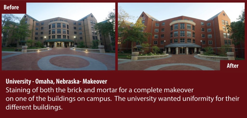 The second Makeover Project took place on the campus of a university in Nebraska. Wanting more uniformity on the campus, the University did a complete makeover on one of its buildings. All the mortar was stained first, and then the brick as well.