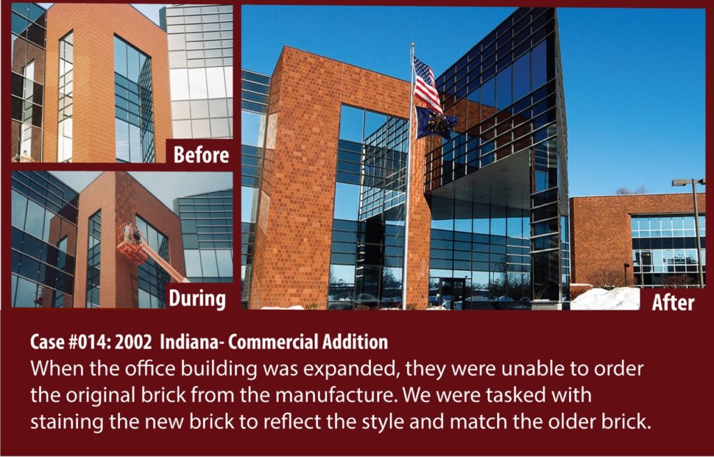 The TTBS could be a highly valuable tool for Architects and Building Owners of all kinds. When planning building additions and matches or acceptable replacements for discontinued brick cannot be found, then staining with the right product clearly should be considered. There are two options. The first option - matching the original building’s brick via TTBS - is a scenario that we have overseen successfully time and time again. Case Study #014, pictured below, is such a project. It was finished 21 years ago. Matching brick for the addition was no longer made nor easily available. A donor brick (brick selected to be stained for a better match) was found. The donor brick were installed, cleaned and then stained to match. That completed project was rechecked in 2023 and looks as attractive today as the day it was stained.