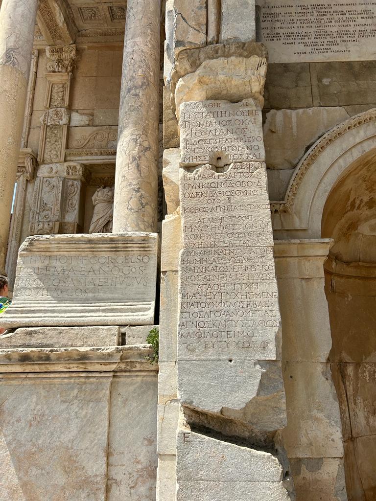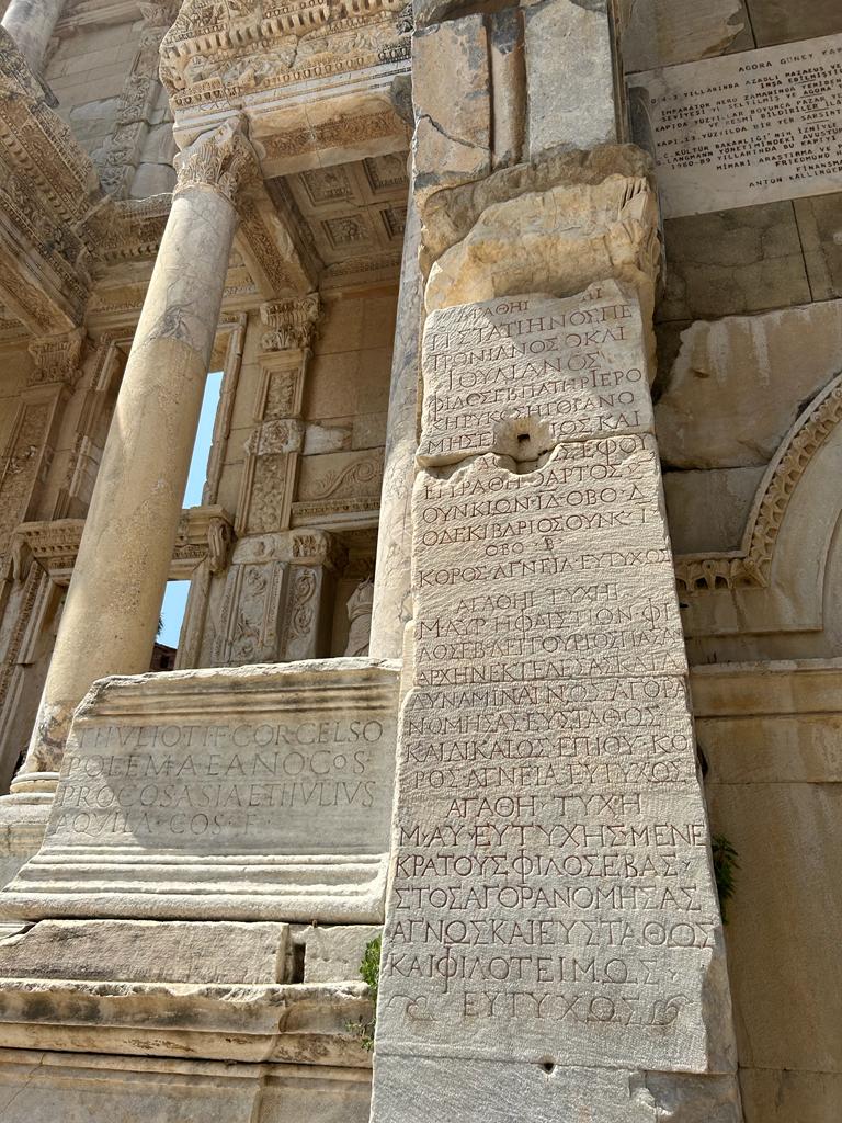 In addition to the expansion of the amphitheater, a great Library called the Library of Celsus was erected. It acted as a repository for important texts from around the world and to support the cultural and intellectual life of the city. The library was one of the most iconic and impressive structures of its time, known not only for its architectural grandeur but also for its extensive collection. A massive façade considered a masterpiece of Roman architecture featured two stories with a central portal framed by four pairs of Corinthian columns and was adorned with detailed statues and reliefs. Unfortunately, the library's vast collection of scrolls and books was nearly all destroyed sometime in the third century. Works by Greek philosophers like Plato, Aristotle, Socrates, as well as legal texts and political treatises, were likely among the collection before its demise.
