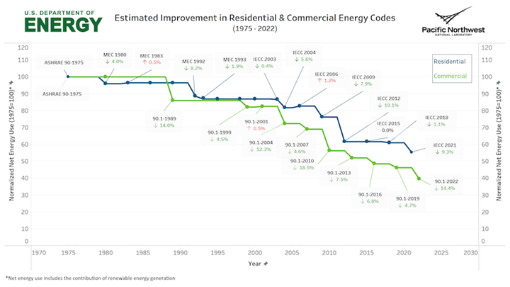 The net effect, at least as far as exterior walls in buildings go, is that ever-increasing levels of wall insulation were and are needed to pass the energy code. This extra insulation, along with improvements in lighting and HVAC systems, have resulted in today’s building using only 40-60% of the energy that would have been needed had these codes not been written and adopted. See Figure 1.