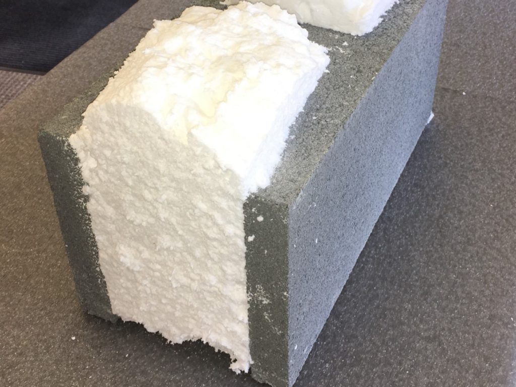 Injection foam, because it does not require special, proprietary CMU shapes and fittings that many of the rigid insert insulated CMU systems use, it can speed delivery of any architectural or custom-made CMU to your job site. Injection foam only adds about $1.00 to $1.50 per block, depending on the size of the block and which market you are in, versus the much more costly rigid foam insert systems. Plus, there is no need for block plants to buy or rent the special molds needed to make the proprietary system CMU. Injection foam works equally well in single-wythe or cavity walls. This article focuses on single-wythe CMU walls. (Insert Photo 1 here – An injection foamed CMU).