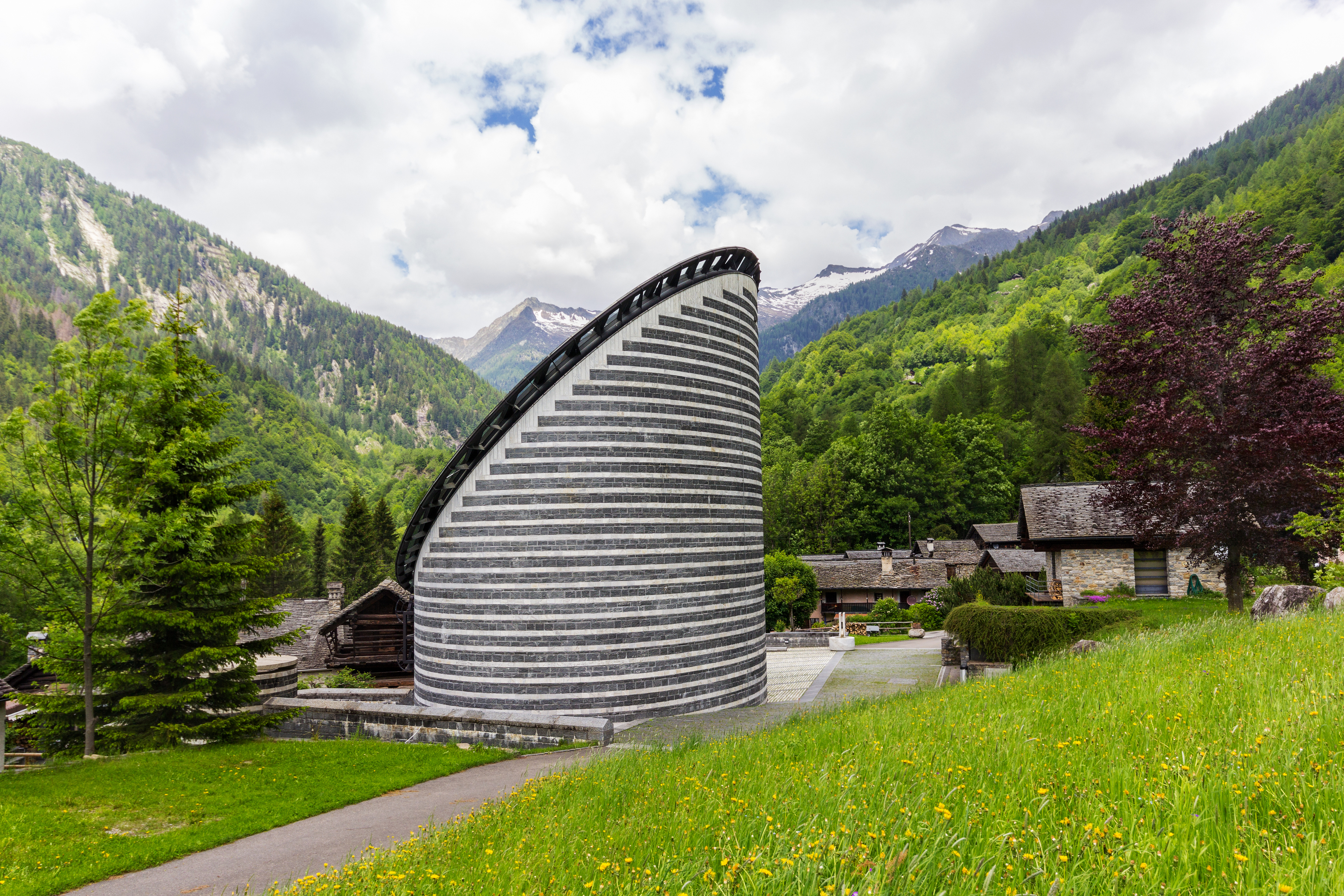 Amidst the traditional Swiss village buildings made of warm-toned wood, the church stands apart with its captivating black and white striped pattern and uncommon shape. San Giovanni Battista was rebuilt better than ever in its original site as a symbol of rebirth and renewed strength.