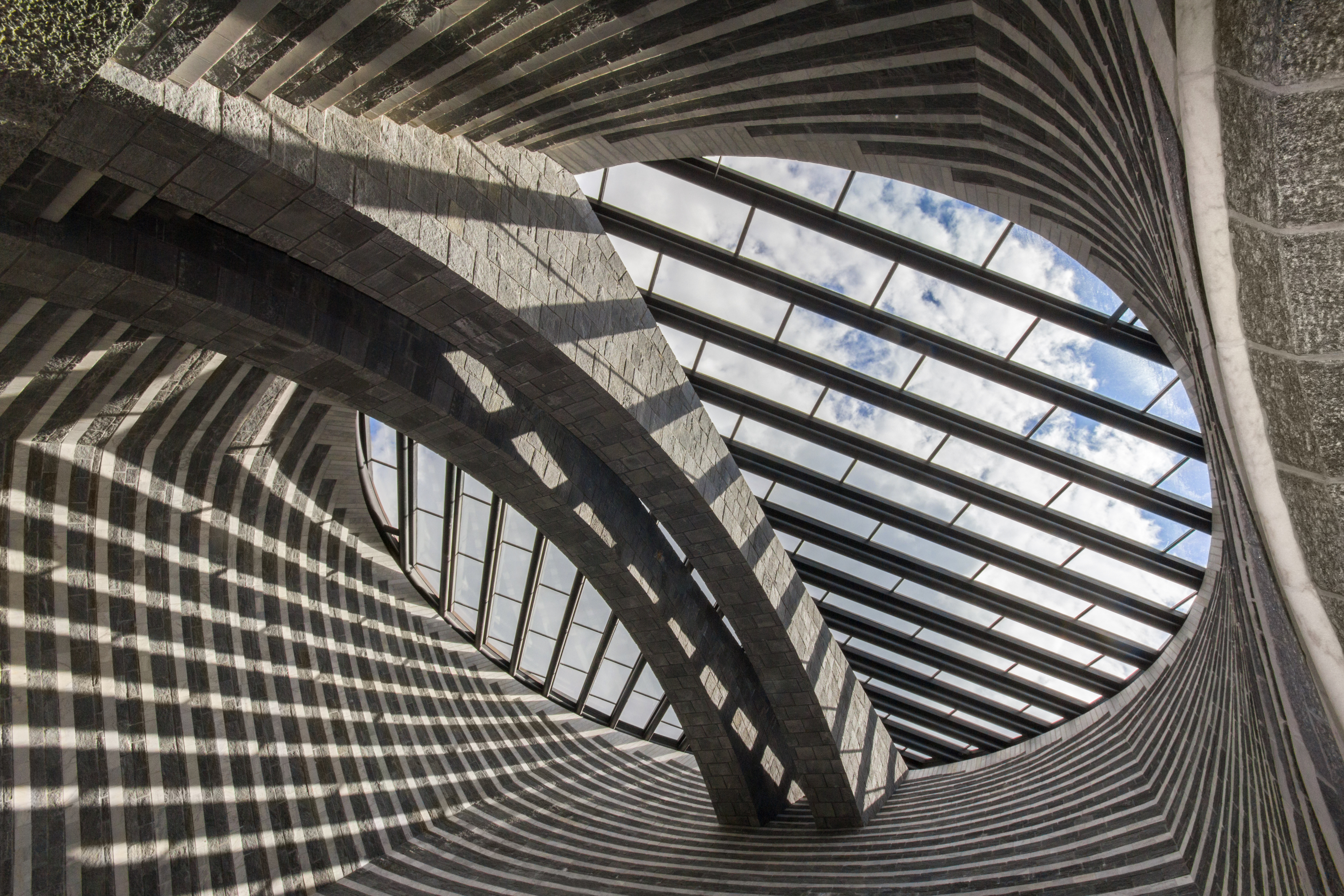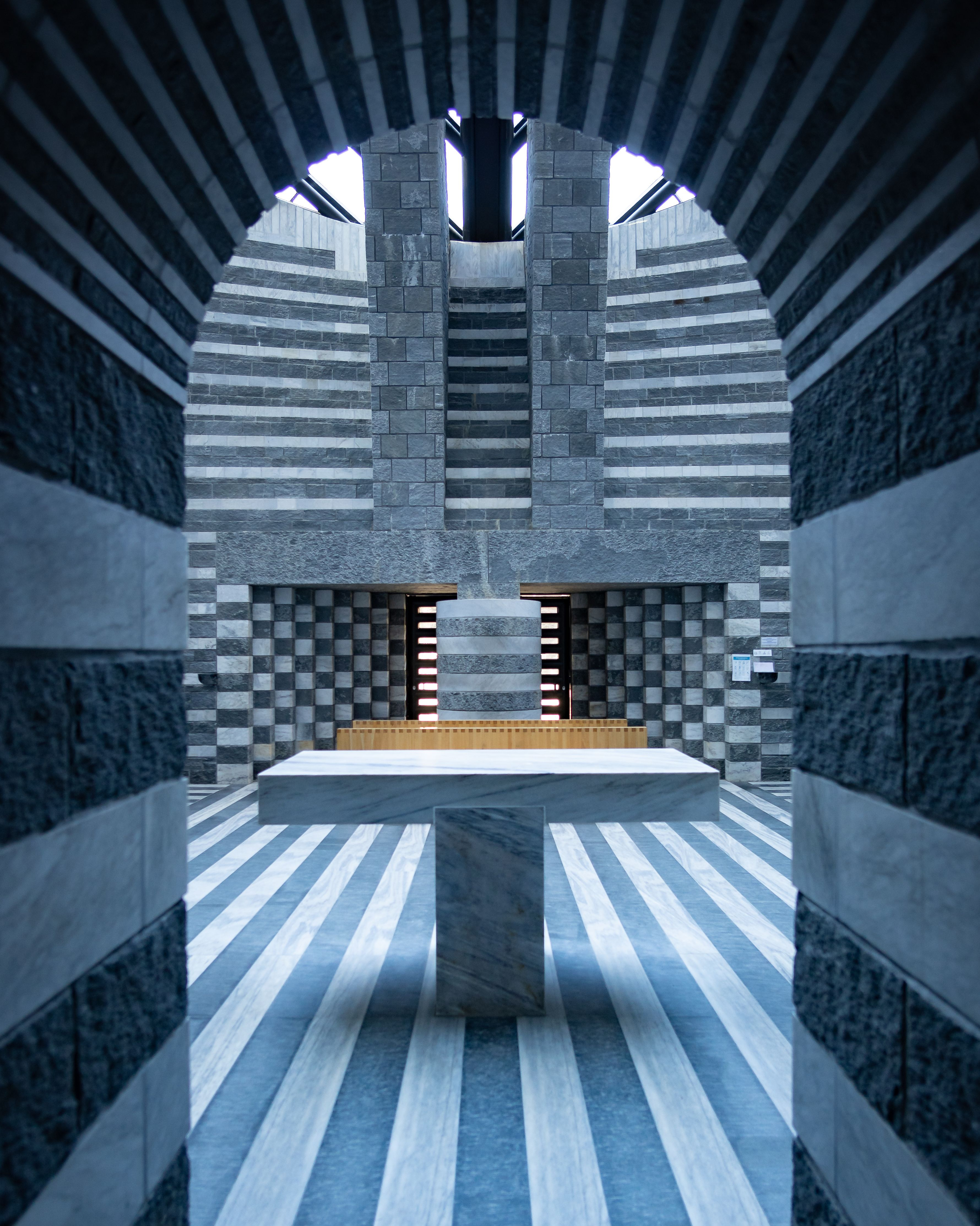 The interior church feels like stepping inside an optical illusion. The lighter-colored bands around the room brighten the space, while the dark bands define the space. As you follow the lines around the room, they lead to the glass and iron ceiling, encouraging you to gaze up into the sky and soak up the natural light.