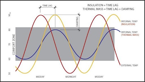 Most 4” (nominal) thick brick walls can qualify as a “mass wall”, based on their calculated heat capacity, which can reduce the requirement for excessive amounts of insulation in the exterior walls, as compared to other wall assembly systems. The “mass wall” effect reduces energy demand and reduces the cost of construction as well as reduces ongoing operating costs for temperature control. Mass walls have two distinct energy advantages: 1) they act as capacitors and take time to heat up and cool off, introducing a time lag, of shifting the peak temperatures to later in the day, potentially to off-peak hours, and 2) mass walls have insulating properties which act as dampeners, reducing the heating and cooling demand on the substrate wall and interior space. ASHRAE 90.1 recognizes the benefits of mass walls by reducing the required insulation for mass walls, as compared to other wall systems, for the various climate zones.