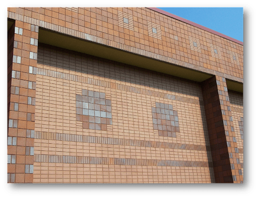 Veneer brick can be produced in many sizes and profiles and can be assembled to produce many different shapes and forms. Of particular design interest of late are perforated screen walls, such as the image to the right, which can require some special shapes to achieve the desired pattern of openings: