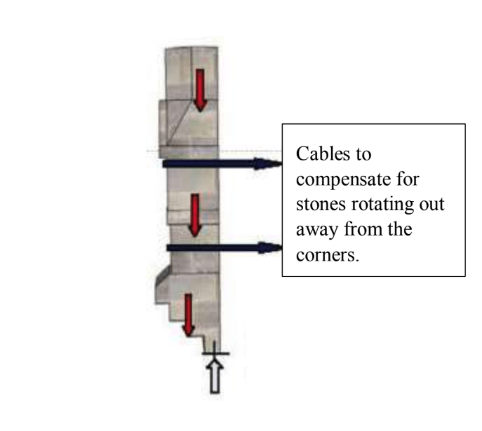 Figure 5 shows the cable concept schematically. The cable only retains the corners. Wooden crush plates are used to prevent stone damage as the cable turns the corners.