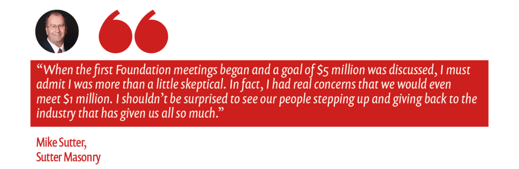 We also set a goal for the Foundation to hit different levels in different phases. Our first phase was to hit $1 million, and our final phase would be to hit $5 million. I have to say, many on the Executive Board were very hesitant to embrace the $5 million mark. Some felt it would be difficult, at best, to hit $1 million. Nonetheless, we moved forward with our two phases. The Executive Board chose not to solicit supplier members and non-members until we reached the halfway mark of $2.5 million. The Executive Board wanted suppliers to know that mason contractors were serious about doing this, and were willing to put their money into it before asking for their support.