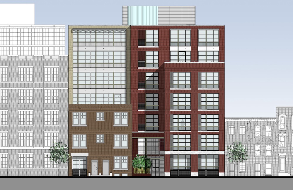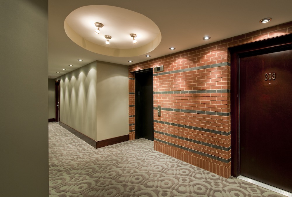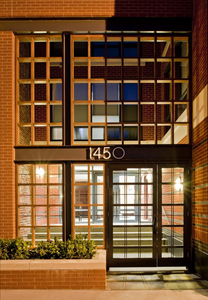 A setback glass curtain wall in the two-story entryway of the complex creates the bridge between the historic structure and the new apartment building. The courtyard walls keep up the central brick-laden theme found throughout the complex.