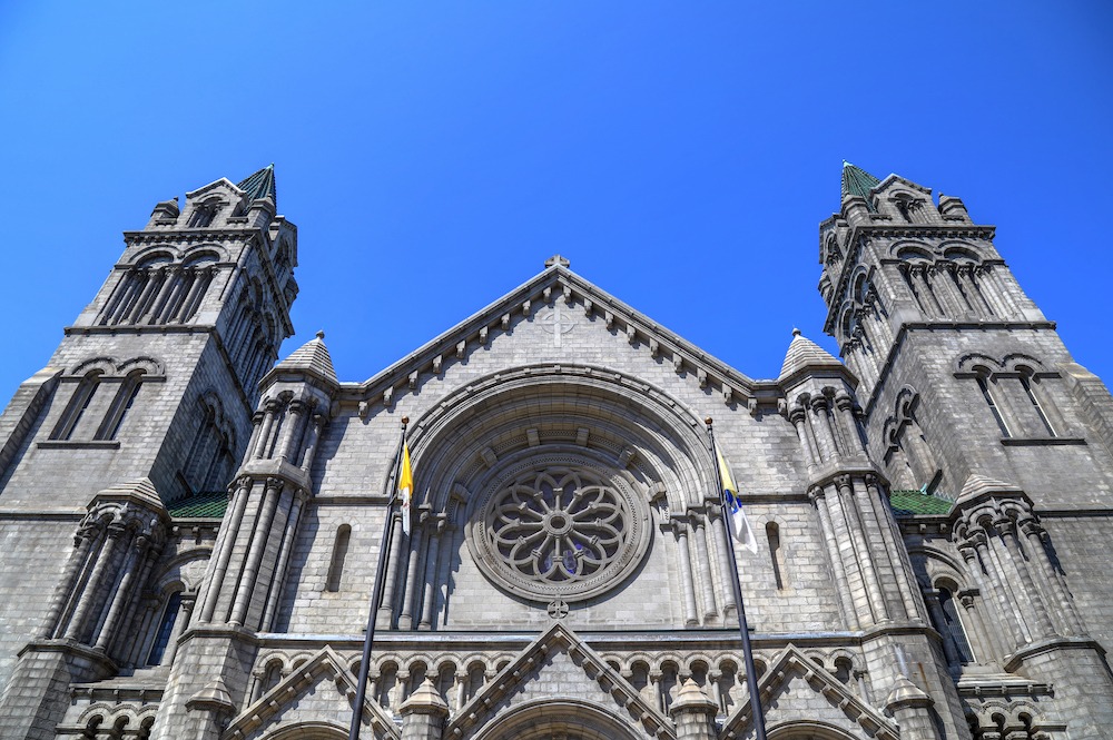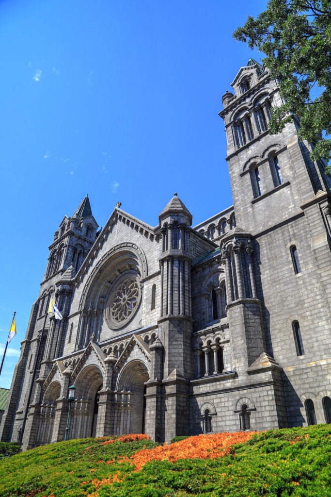 The Cathedral Basilica is constructed out of granite and features three domes, two spires, and contains four chapels inside for 5,000 worshippers. Inside the cathedral is constructed from brick, marble, and mosaic tiles.