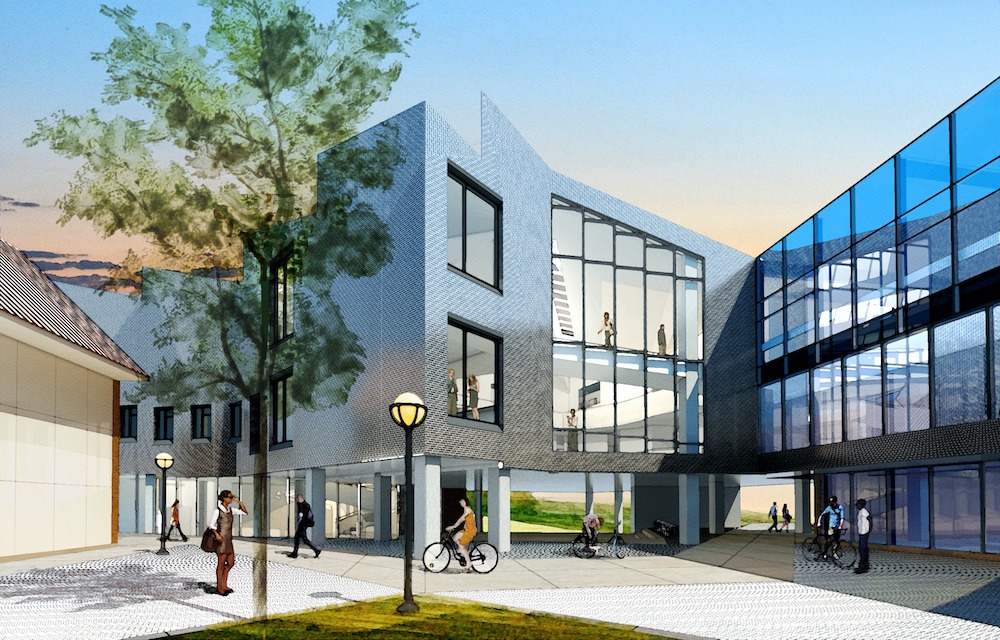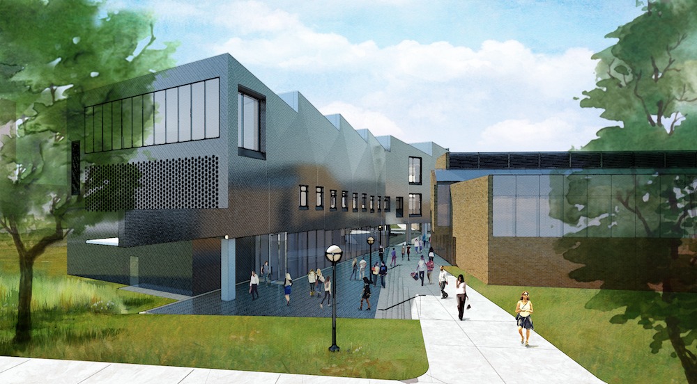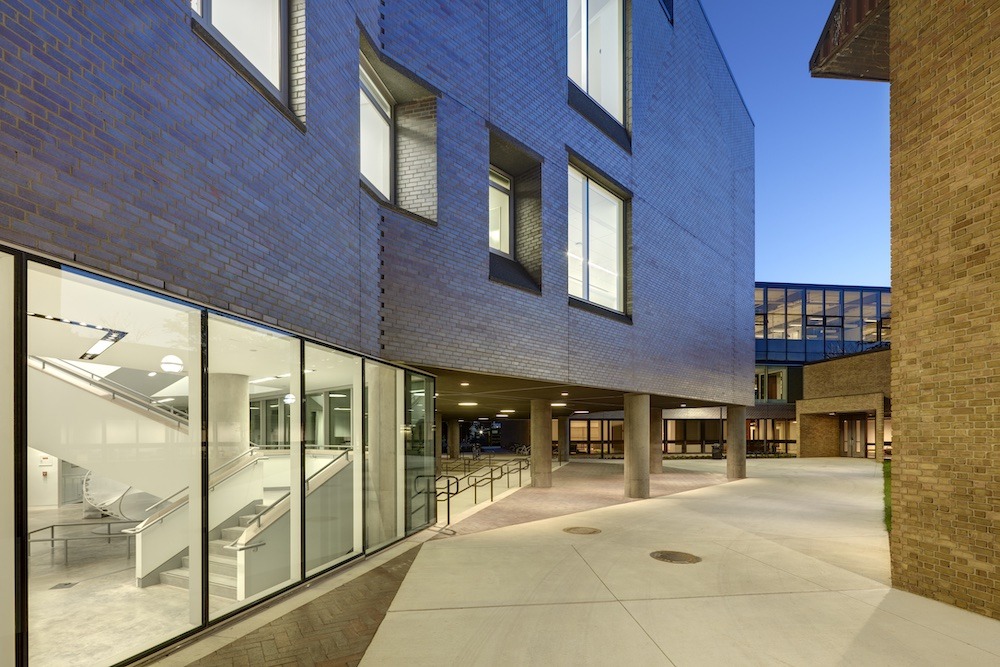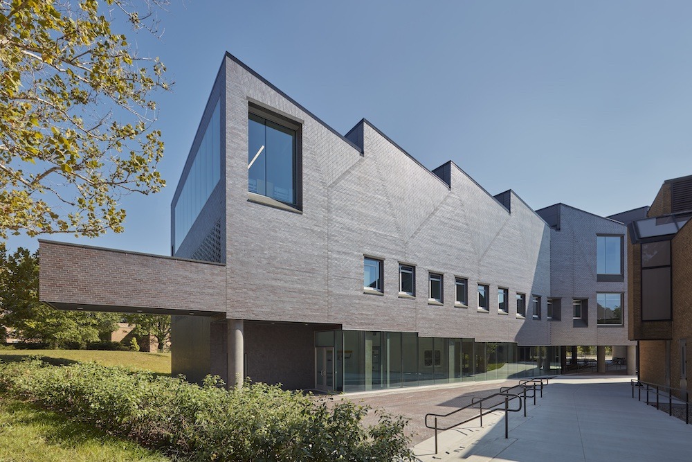 Brick patterning breaks up the façade when close to the building adding to its dynamic form with the north façade set in a herringbone pattern with a Flemish bond brick louver providing air intake and exhaust for the building. On the east and west facades, the brick patterning comprises both horizontal and vertical 1/3 running bonds. Since the building is reaching out from the College’s primary classroom space to the south, the plan bends, creating an inviting opening between the new wing and the existing building. These “bends” are articulated with woven brick creating small voids in the elevation as the brick turns the corner rather than introducing custom brick shapes.