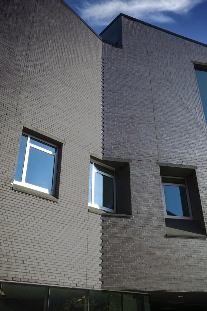 The only real challenges for the masonry portion of the project revolved around getting the precast concrete sills and wall panels to be as dark as the brick. Thanks to our careful study of the brick pattern and setout, the laying of the brick was smooth. This, of course, wouldn’t have been possible without careful attention to detail on the part of the mason contractor, who did an outstanding job in realizing the vision. They addressed this with rounds of color matching to overcome the issues with the precast elements as several samples and iterations had to be made to get the near-black color to the pieces.