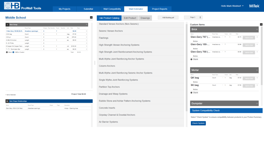We’re excited about the Estimating tool, because it’s our latest release (and there are more to come!), but we can’t forget about the other amazing tools ProWall has to offer: Submittal Portal and Wall Compatibility. The Submittal Portal, our first release, allows users to create submittal packages of H&B products as fast as 10 times faster than standard methods. You can select all the H&B products for your project on one page and generate a report that features: submittal sheets, images, LEED, SDS and CAD details with a push of a button. The Wall Compatibility tool allows you to check against your local code and instantly generate a certificate showing that all of your selected products are completely compatible.