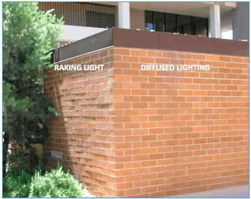 Built by the same mason, using the same brick, at the same time, these 2 walls look very different. Sunlight raking down the left side highlights every little misalignment. The correct way to look at a brick wall is under “diffused” or indirect lighting, as shown on the right side.