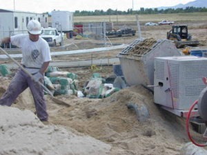 This contractor fixed a 12” x 12” x 12” plywood box to the mixer using eyebolts and chain links. Fill up the box with a shovel, then tip your cubic foot of sand into the mixer.