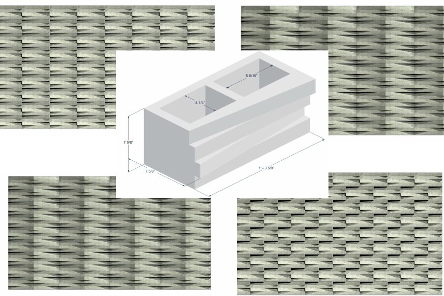 From left: Victor Cochoff; Joyce Gemarino; Kristen Kellogg; Devaqnuyah Reuven. (Not pictured: Joshua T. Word and Prof. T. Russell Gentry)[/caption] [caption id="attachment_16108" align="alignnone" width="900"] Pivot Block unit drawing and architectural effects created by stack bond, mirrored stack bond, running bond, and mirrored running bond[/caption] Full final reports of the above competitions including the presentations of the second and third finalists for are posted on the NCMA Foundation web site for the following years: [2014], [2013], [2012], and [2011]. (Go to https://ncma.org/foundation and click on “Foundation-Sponsored Programs“ in the menu on the right, then on “Funded by: Research Grants” and then “Final report” for the following projects: 2013.057, 2012.013, 2011.030, and 2010.020 respectively). Further information on the Unit Design Competition itself can be found on the NCMA web site at https://ncma.org/foundation, then click on “Unit Design Competitions” in the right menu. Included on this page is a link to guidance on “How to set up Unit Design Competition at Your University.” Alternatively you can contact Jason Thompson (jthompson@ncma.org) or Frank Werner (Frank.Werner@oldcastle.com) directly. Note: The NCMA Foundation Unit Design Competition is oftentimes confused with the two other student design competitions also funded by the Foundation – the Architectural Student Design Competition and Engineering Student Design Competition. Information on the latter two can be found on the same web site https://ncma.org/foundation and clicking on “Student Design Competitions Guidelines” in the right menu.