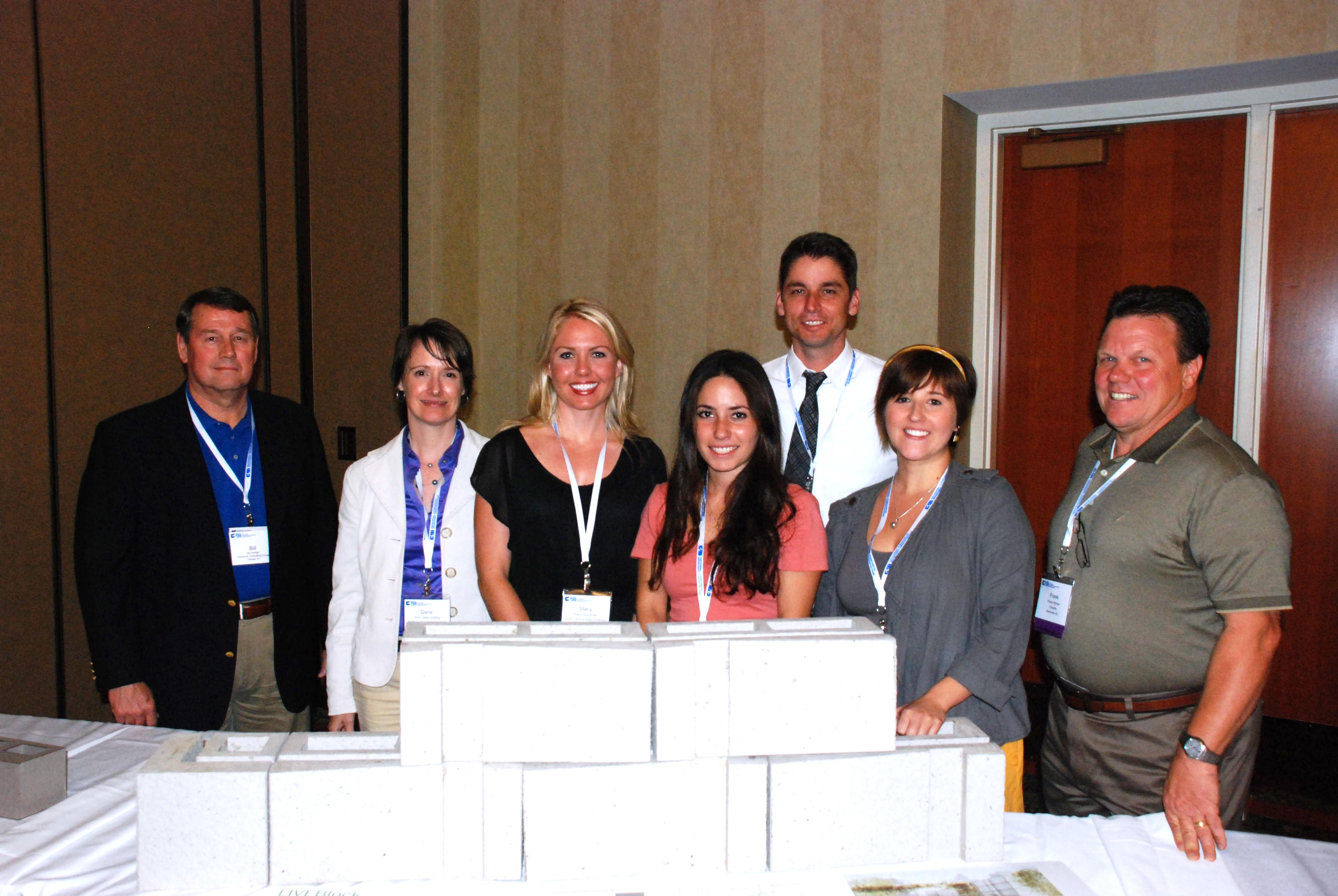 From left: Rick Muth, ORCO; David Nicholson; Prof. Eric Nuhlman; Morenike Somoye; Stephanie (Muth) Watts, ORCO[/caption] [caption id="attachment_16106" align="alignnone" width="900"] A variety of architectural effects can be created with the Medley Block – Fieldstone, Stringcourse, Diagonal Striations, and Wave[/caption] 2012: “LiveBlock” - North Carolina State University sponsored by the Carolinas Concrete Masonry Association, Adams an Oldcastle Company and Johnson Concrete Company “LiveBlock” is a masonry unit that essentially is produced with a veneer already attached to the block. The webs attaching the veneer are much smaller than those of the backup providing a sizeable cavity space for drainage and insulation. The insulation cavity can be up to 6-inches resulting in very high R-Values and very sustainable wall sections. Additionally, if the webs attaching the veneer meet the ASTM C-90 minimum web requirements and the veneer itself meets the minimum face shell requirements, the full thickness of the entire unit can be considered effective for structural purposes including reinforced masonry design. [caption id="attachment_16091" align="alignnone" width="3872"] 2012 winner - North Carolina State University