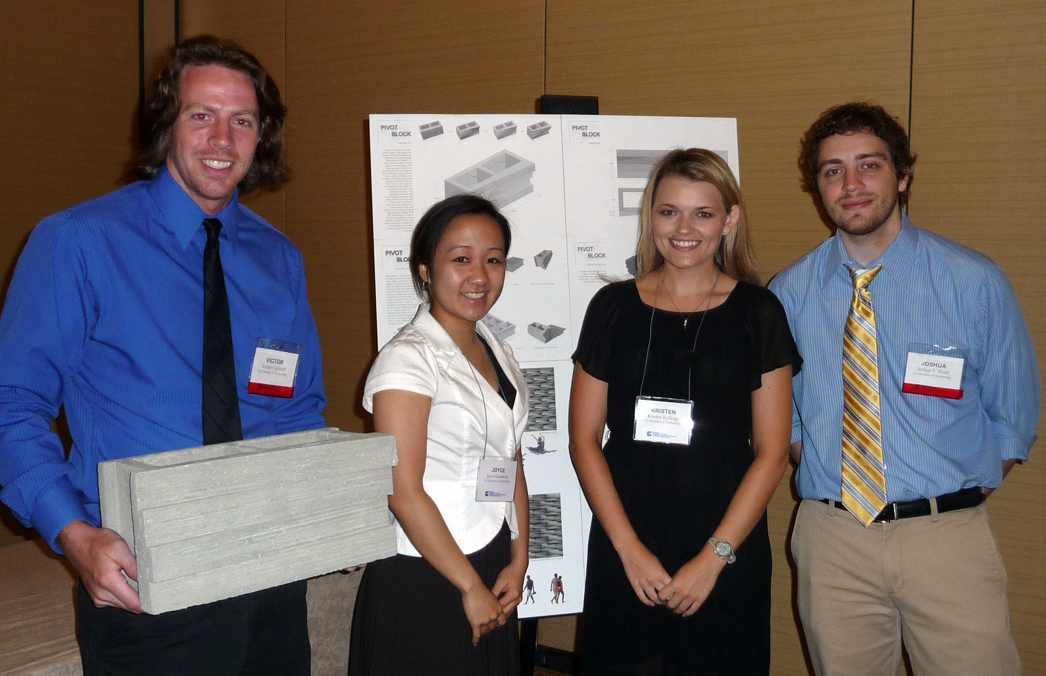 From left: William Holden, Chairman, NCMA Education and Research Foundation; Prof. Dana K. Gulling; Stacy Goodman; Elizabeth Gutiérrez; K. Matt Teti, L. Katy Liang; Frank Werner, Chairman, NCMA Unit Design Competition Task Group[/caption] [caption id="attachment_16107" align="alignnone" width="900"] “Live Block” has the veneer preattached saving installation and energy costs. [/caption] 2011: “Pivot Block” – Georgia Institute of Technology sponsored by Block USA “Pivot Block” consists of a block split into four horizontal segments pivoted around an axis in the center of the block as shown in the attached figure. Through various block rotations and bond variations, a host of architectural effects can be obtained such as stack bond, mirrored stack bond, running bond, and mirrored running bond. [caption id="attachment_16094" align="alignnone" width="2060"] 2011 winner – Georgia Institute of Technology