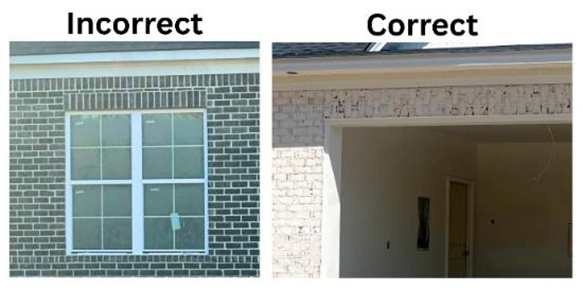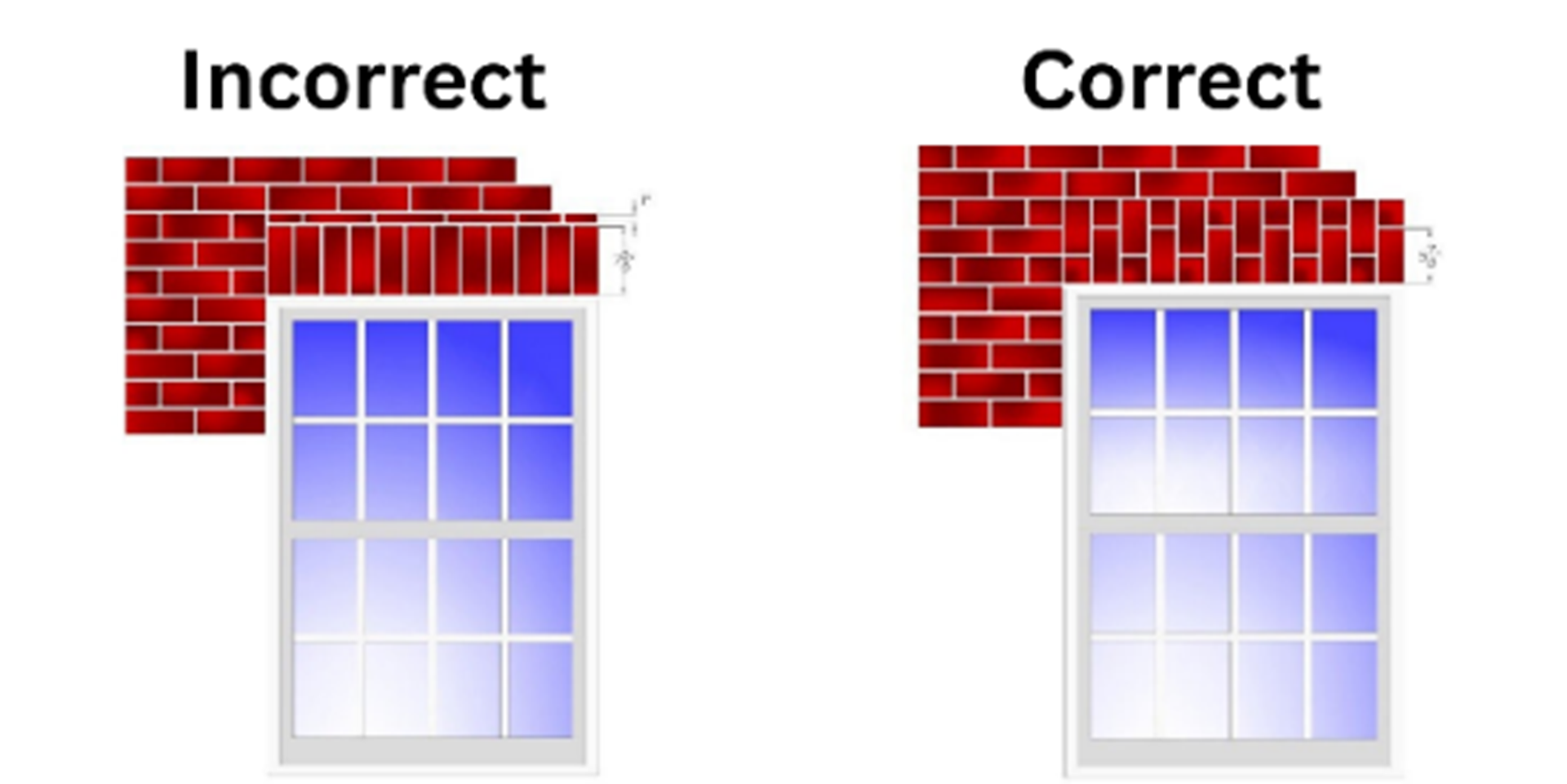 However, this creates an inconsistent look, and if too thin, these bricks are more susceptible to freeze-thaw damage. If you find yourself in this situation, the better approach is to use a rowlock combined with a properly cut soldier brick, so the coursing transitions cleanly back into the running bond. The course directly above the opening consists of a staggered combination of rowlocks and clipped soldiers, with each alternating, one acting as the lower unit and the next as the upper. When laid this way, the running bond above aligns perfectly. The key is controlling the total height by properly cutting the soldier bricks, ensuring the entire wall returns to correct coursing without any thin, awkward filler pieces.