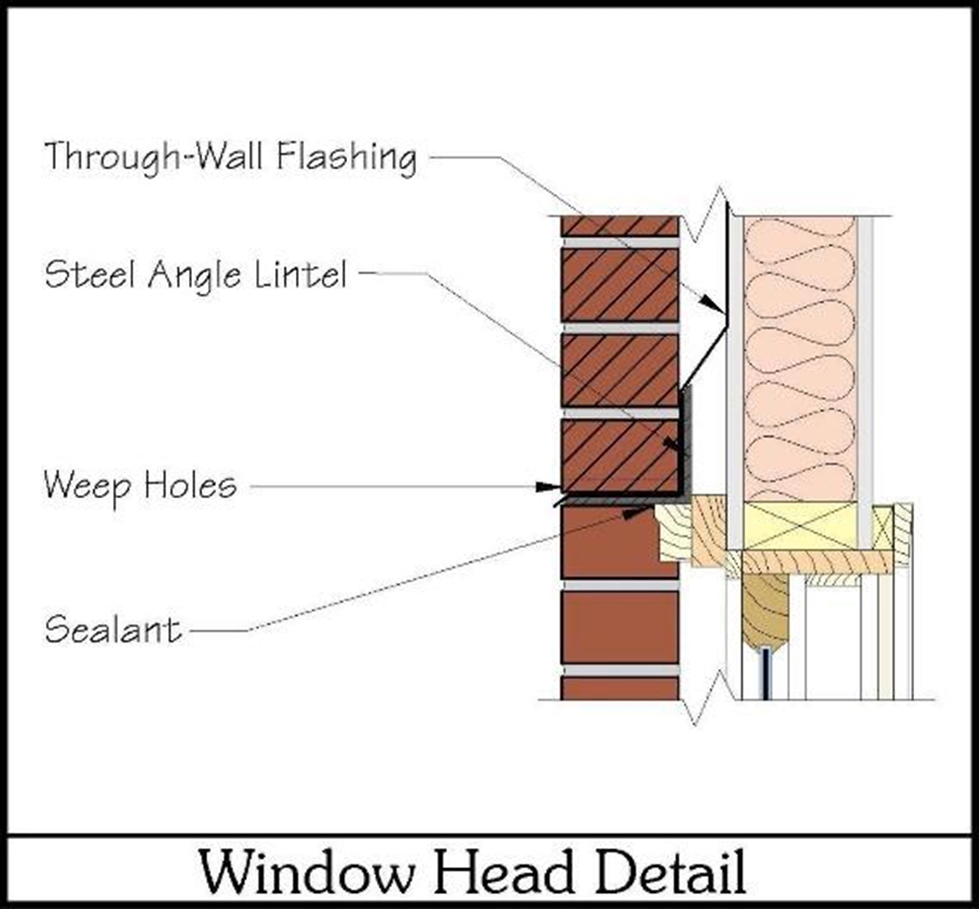 This diagram depicts the proper installation of flashing at a window head to allow water to exit outward.