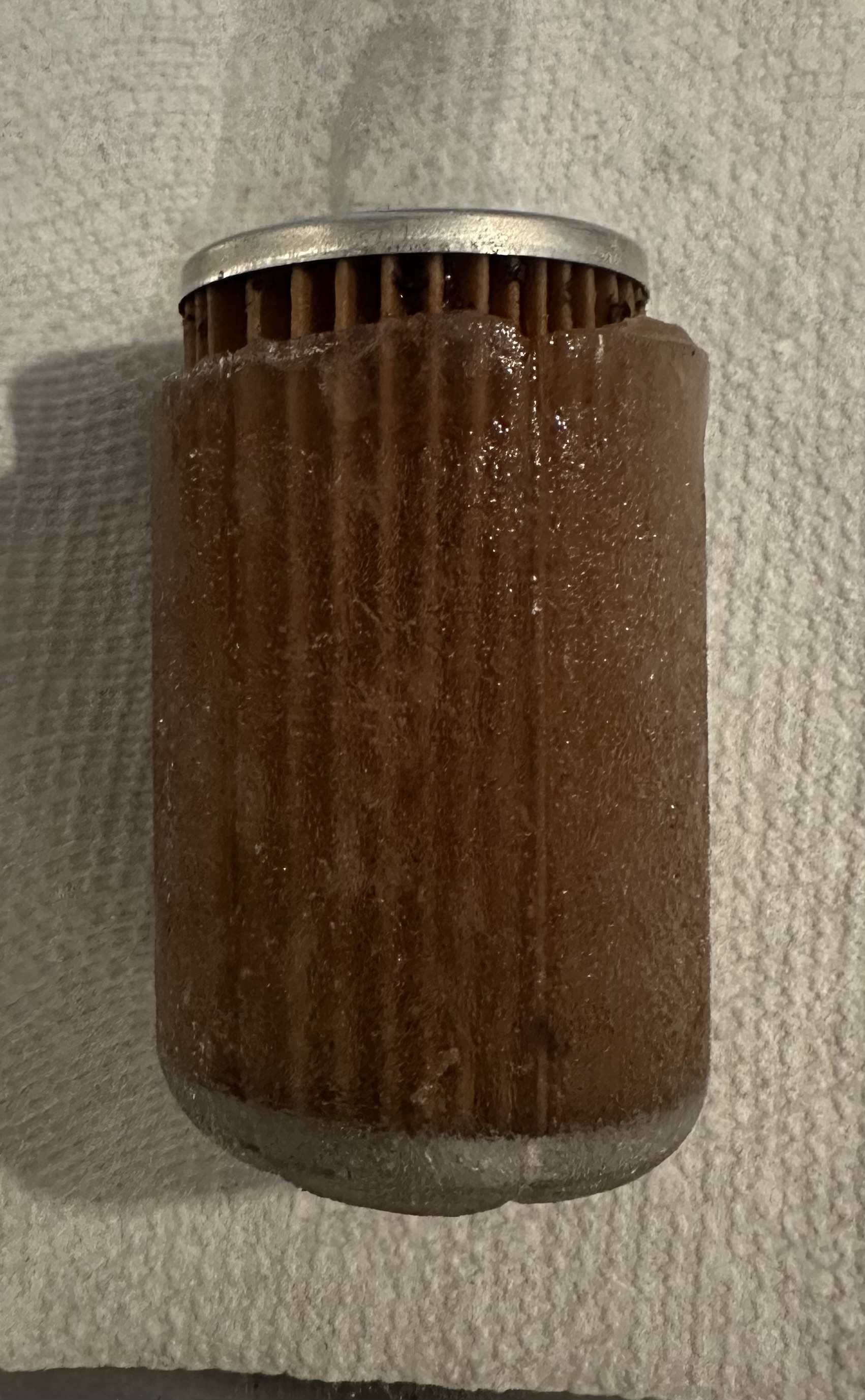 My next step was convincing myself that it was worth getting on the cold ground to fix the problem. After shutting off the fuel lines, the removal of the fuel filter was really easy, and the problem was obvious: The water in the fuel filter assembly was not drained by my mechanic, never trust a mechanic that wears a cowboy hat and looks just like me, and the frozen fuel filter was surrounded by ice. A quick thaw in the sink with hot water, wiping with a dry cloth, and I was back in business. I conditioned the fuel using a rate of 50% No. 2 diesel fuel to 50% Diesel 911 additive in the fuel filter canister.