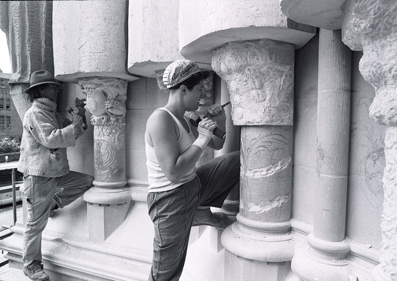 It may have seemed a little hasty to start carving on such a prestigious landmark in such a way, but Simon was well aware that many layers of stone would fall before anything resembling statues could emerge. The work was heavy-handed, but we were literally scratching the surface. Our first step was to punch large rectangular blocks into cylinders.To many, “roughing out” the stone might be considered mindless grunt work, but Simon embraced this stage of the carving. The canvas of bumps, pits and shattered peaks served up a range of images that might later become part of the finished sculpture. The stone fed the imagination. Simon said this was when he did his best thinking. I think it fair to say that Simon was a bit of a purist. I can’t recall him ever using a pneumatic, nor any power tools for that matter. In fact, even his chisels were pretty pitiful. You could have put a railroad spike in his hand, and he would have made it work. In those early days, we were both pretty scruffy and must have looked like vandals to a growing number of concerned onlookers. Eventually, many worthy carvers would join forces with Simon on this project. I can’t help but smile when thinking that this is how the Portal of Paradise project all began.