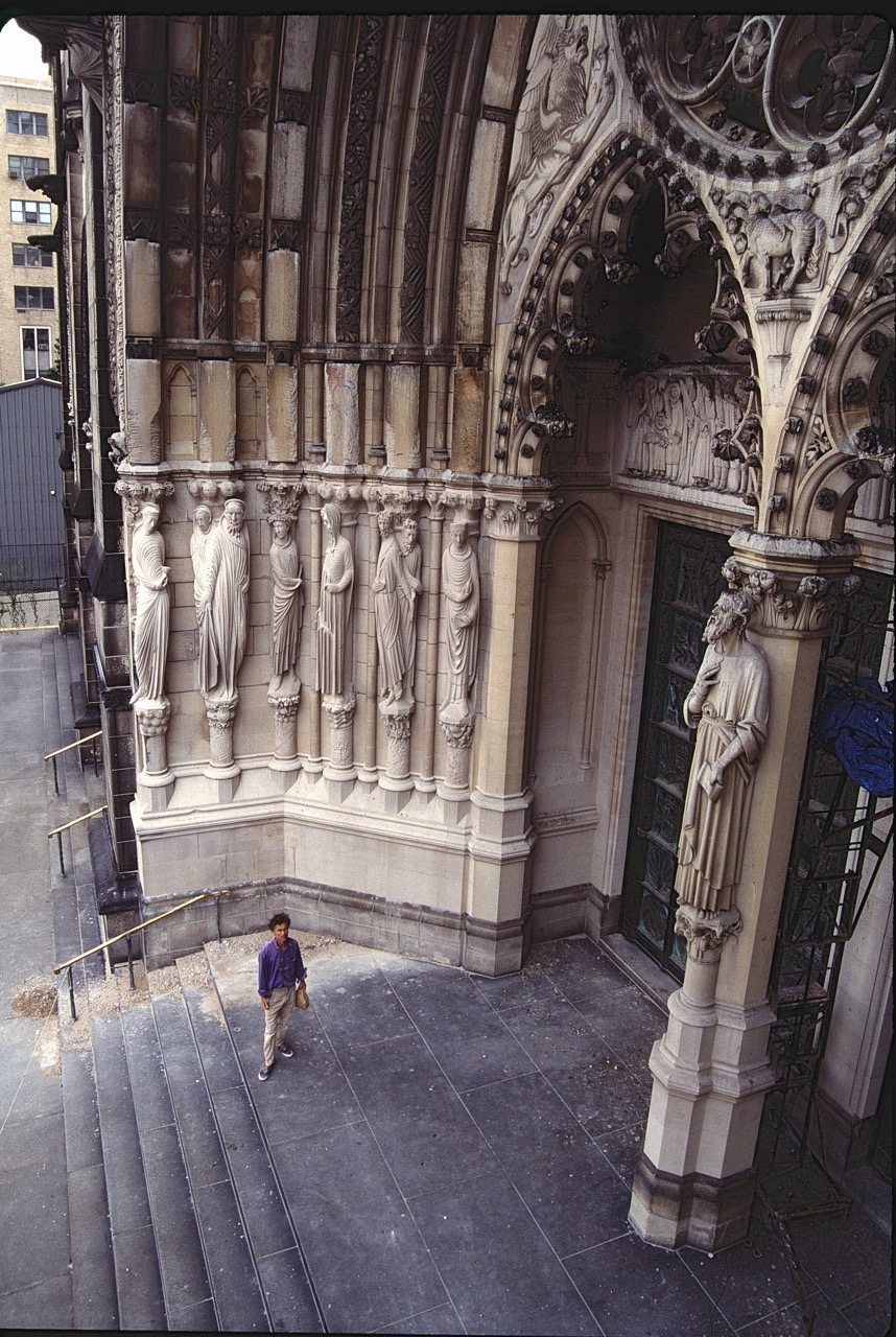 - Simon Verity looks out towards Amsterdam Avenue while leaning on the major figure of Moses on the south side of the Portal of Paradise, 9/29/1995.The head of Moses was carved by Dennis Reed, one of the Stoneyard Institute’s stone carvers. Photo by Martha Cooper