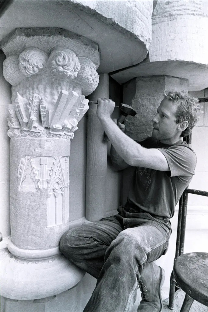 - Joseph Kincannon carves what turns out to be a prophetic vision – the destruction of the World Trade Towers – on the Portal of Paradise seen on Sept. 3 1989. Following the Renaissance tradition of placing biblical scenes in contemporary settings this carving on the Portal of Paradise has become iconic since the Sept. 11 attacks. Also emerging below are Gothic arches, representing the rebuilding of the “cathedral,” a symbol of hope after chaos. Photo by Robert F. Rodriguez