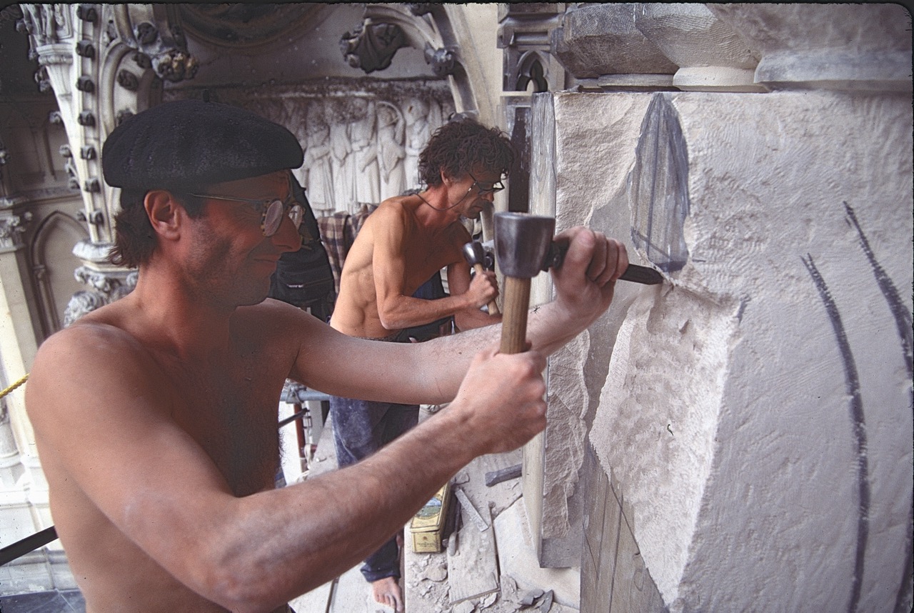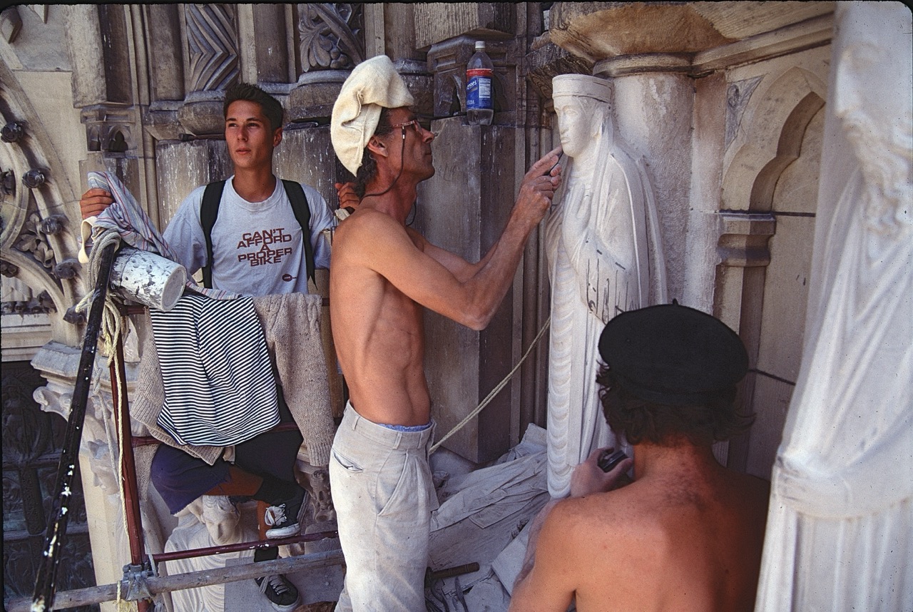 - Jean-Claude Marchionni and Simon Verity working on upper rank figures on the south side of the Portal of Paradise on Oct. 3, 1995.