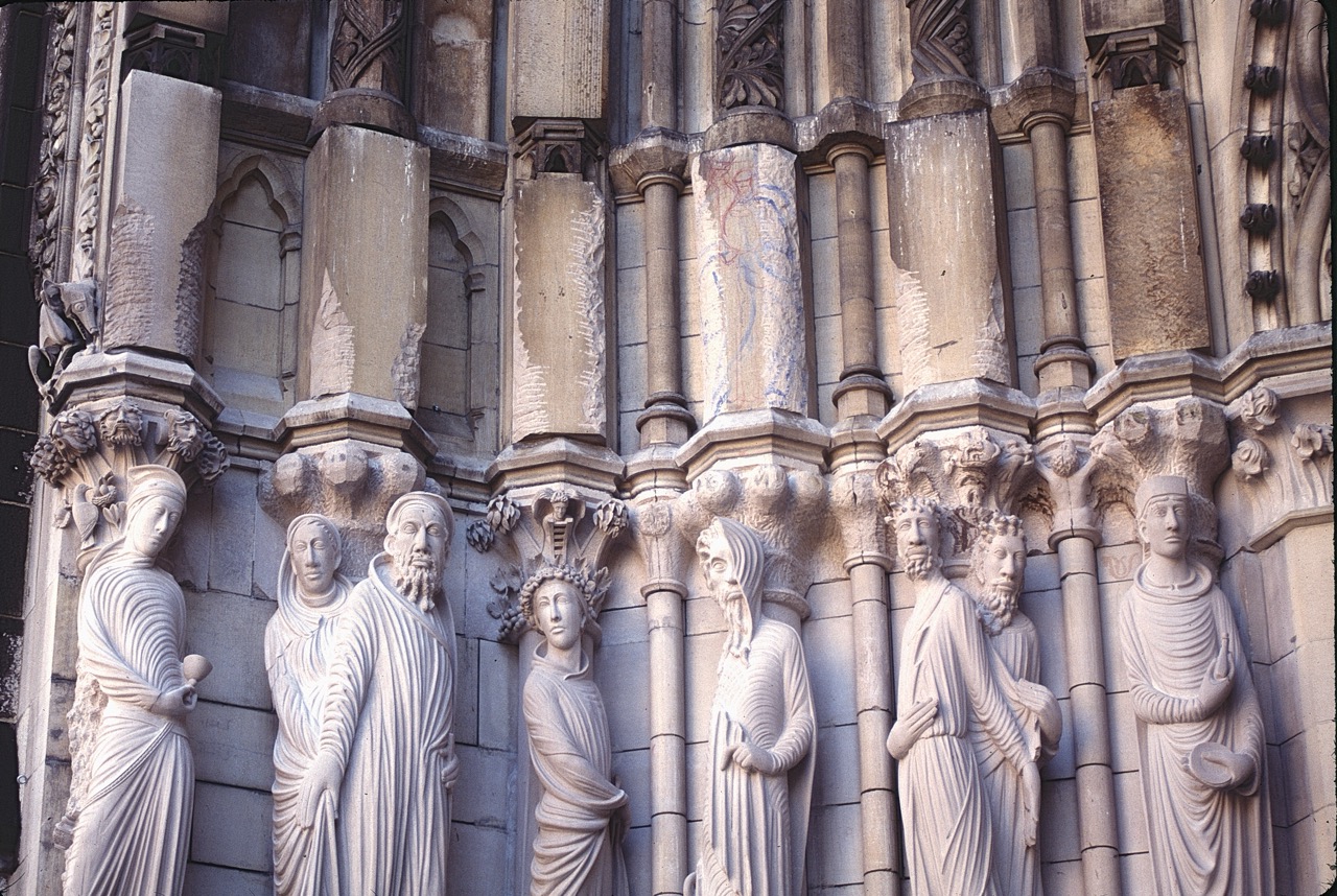 The Portal is the most prominent and probably most frequently photographed work of art at the cathedral. It is also the most misunderstood. Many visitors lack the once-widespread familiarity with the Bible that would enable them to recognize such important Biblical characters as John the Baptist, Moses, David, and Abraham and Sarah. They also lack familiarity with the custom – common since the Renaissance – of transporting to modern times Biblical events such as social unrest in ancient Israel and the destruction of Jerusalem.
