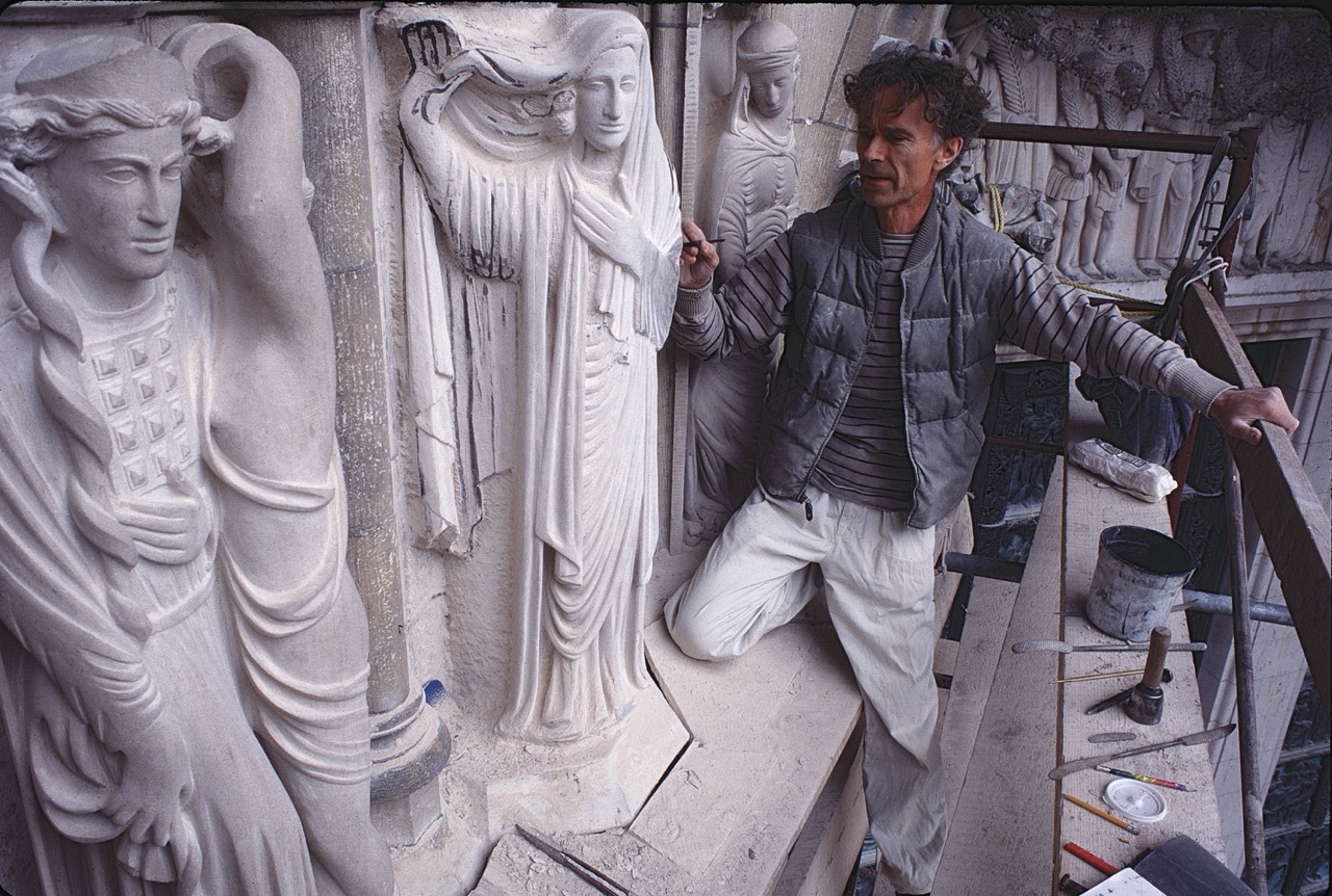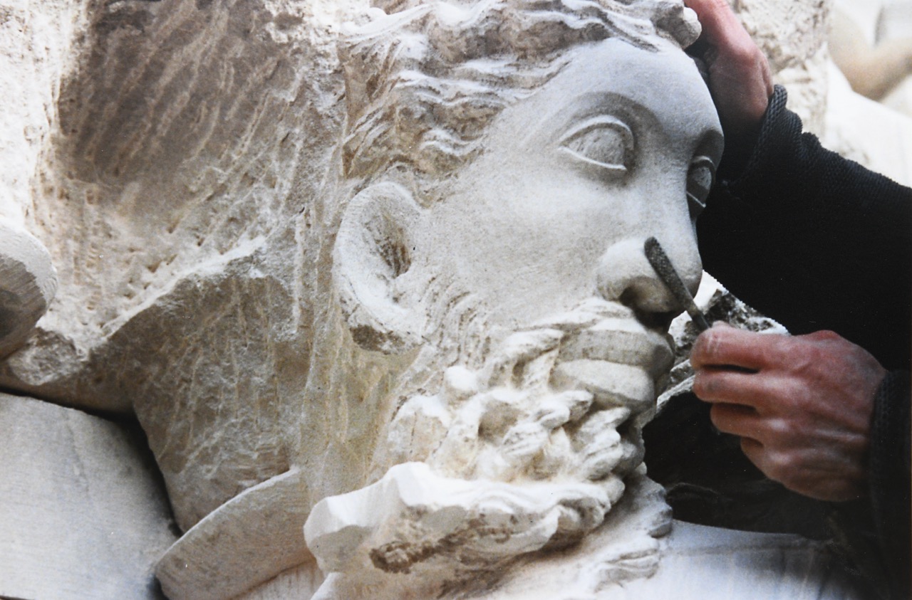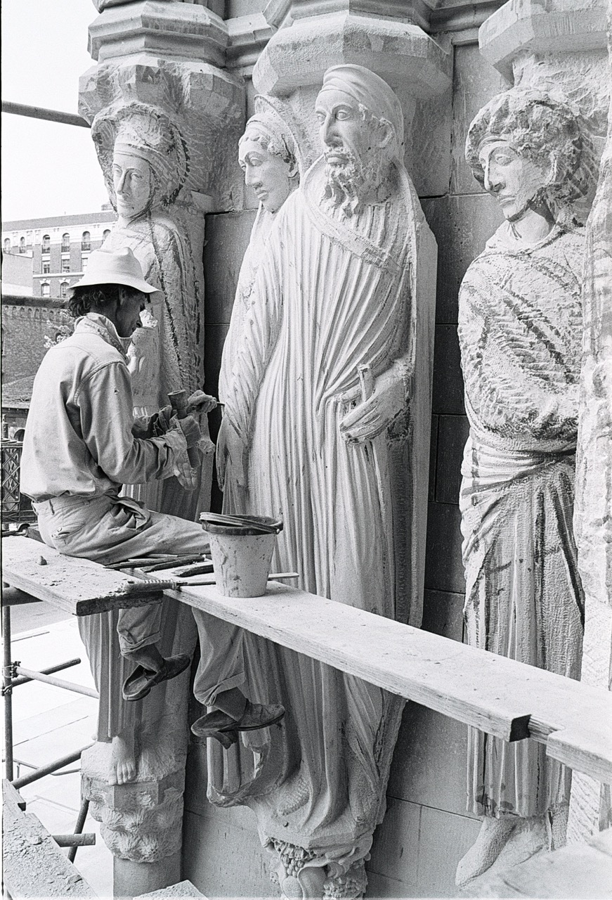 - Simon Verity uses a thin chisel to work on the mouth of the figure of Melchizedek, a jamb figure on the north side of the Portal of Paradise, in October, 1988. Photo by Robert F. Rodriguez