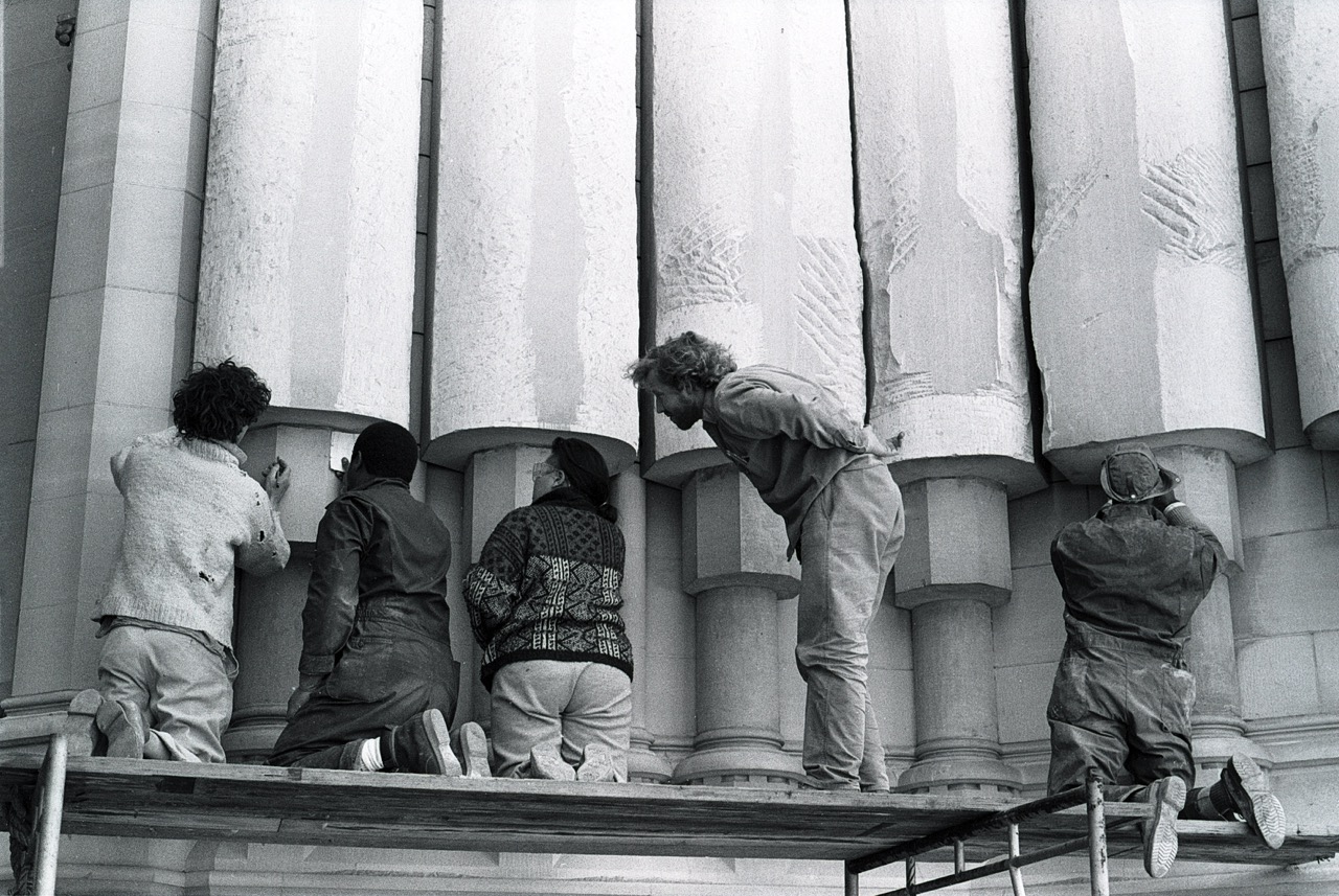 - Master Sculptor Simon Verity prepares a chalk sketch on a pedestal. Carvers Angel Escobar, Jessica Aujero, Joseph Kincannon, standing, and Dennis Reed start work on the pedestals. April 19, 1989. Photo by Robert F. Rodriguez