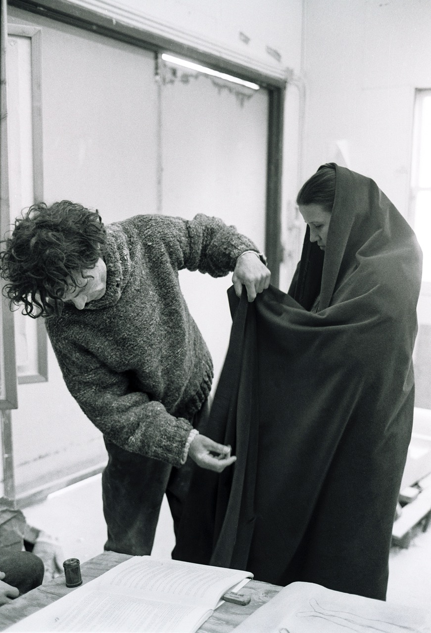 - Simon Verity arranges folds on fabric worn by Gabriele Hitl-Cohen on Oct. 20, 1988 prior to preparing sketches for carving the Portal of Paradise. Photo by Robert F. Rodriguez
