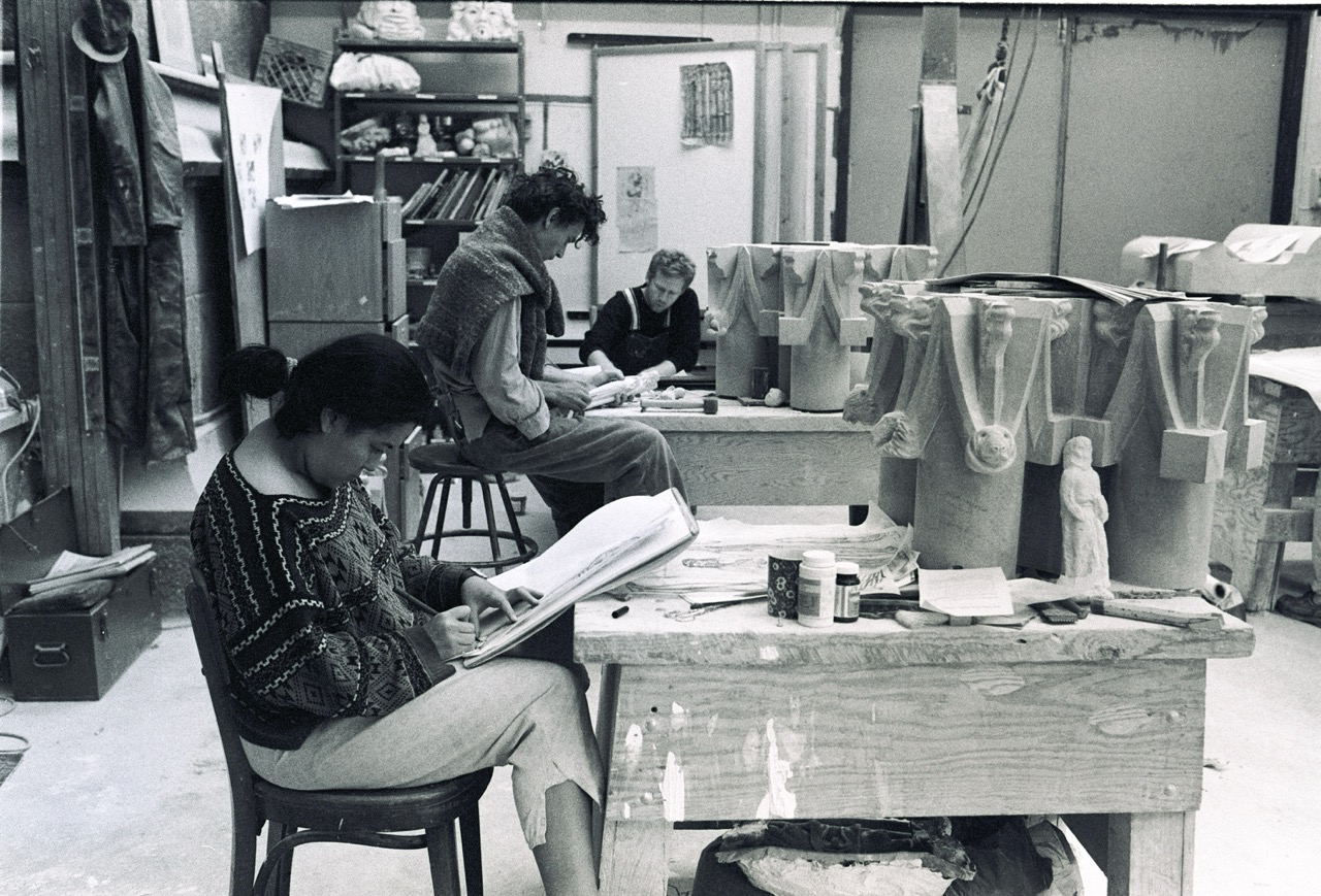 -From left, Jessica Aujero, Simon Verity and Joseph Kincannon are immersed in sketches for their upcoming figure carvings on Oct. 3, 1988.The stone carving team prepared sketches in preparation for carving the Portal of Paradise. Photo by Robert F. Rodriguez