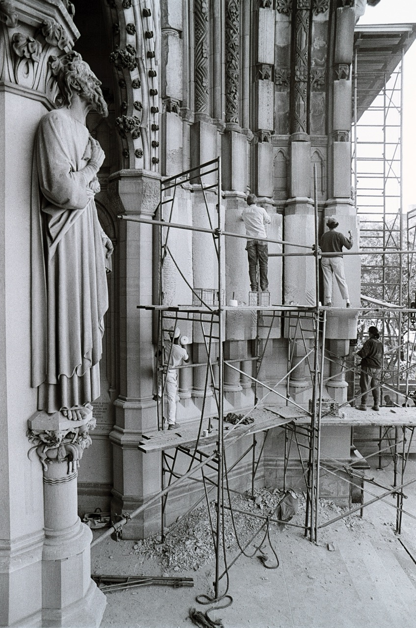 -The figure of St. John the Divine seems to supervise scoring of the stone jambs with Joseph Kincannon and Amy Brier, top, and Dennis Reid and Gabriele Hitl-Cohen on the lower platform on Sept. 14, 1988. Work began on carving the great Central Portal of the Cathedral’s West Front – the Portal of Paradise by rounding out the 12 oblong blocks flanking the bronze doors. Photo by. Robert F. Rodriguez