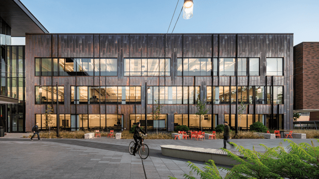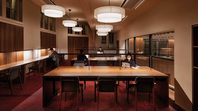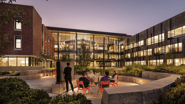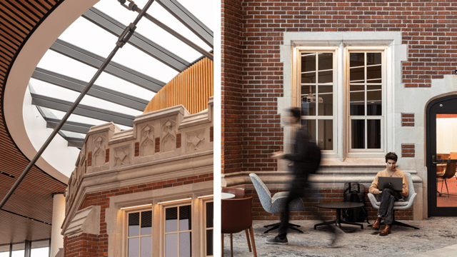 "The way we solved for this was by using the central atrium space as a source of light to the facade of the historic structures," Rob said. "The atrium has glazing on all four sides, which creates an indoor piazza that has become one of the campus's most popular destinations. The eastern side of the atrium is four stories of floor-to-ceiling glass which brings in abundant daylight and allows the building's occupants to enjoy views out to a new plaza space that incorporates outdoor classrooms and cafe seating. The idea was to create a glass veil that blurred the boundary between the amenity spaces inside and out and framed Alumni Recitation Hall's beautiful facade."