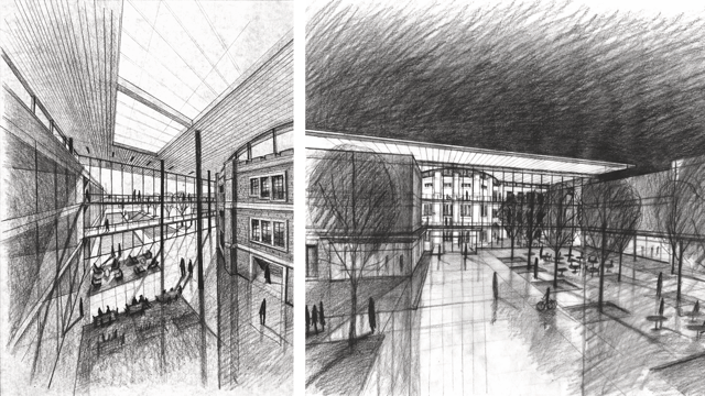 project is at the intersection of four pavilions, unified by a three-story