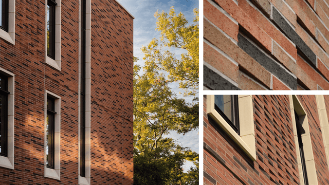 distinct colors that creates a houndstooth-like pattern on its facades which