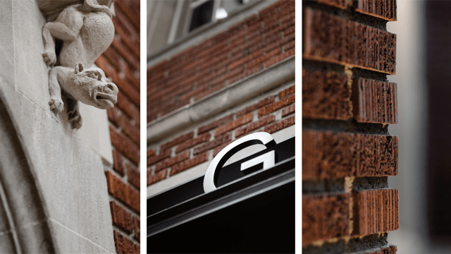 Gothic limestone and brick details in natural light.